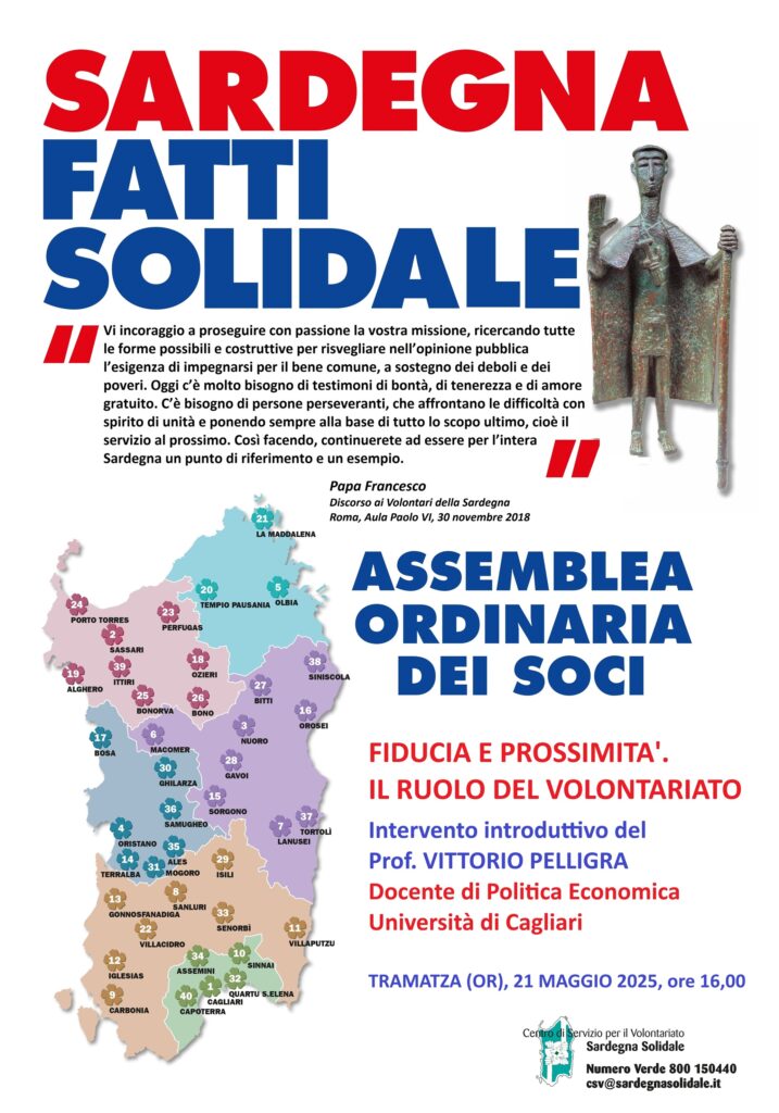 Ieri, 21 maggio 2025, si è tenuta a Tramatza (OR) l’Assemblea dei Soci del CSV Sardegna Solidale ODV. E’ stato un grande successo di partecipazione e di contenuti. L’intervento introduttivo del prof. Vittorio Pelligra ha delineato chiaramente i due binari che il volontariato percorre per creare bene comune e sviluppare comunità: la fiducia e la prossimità.