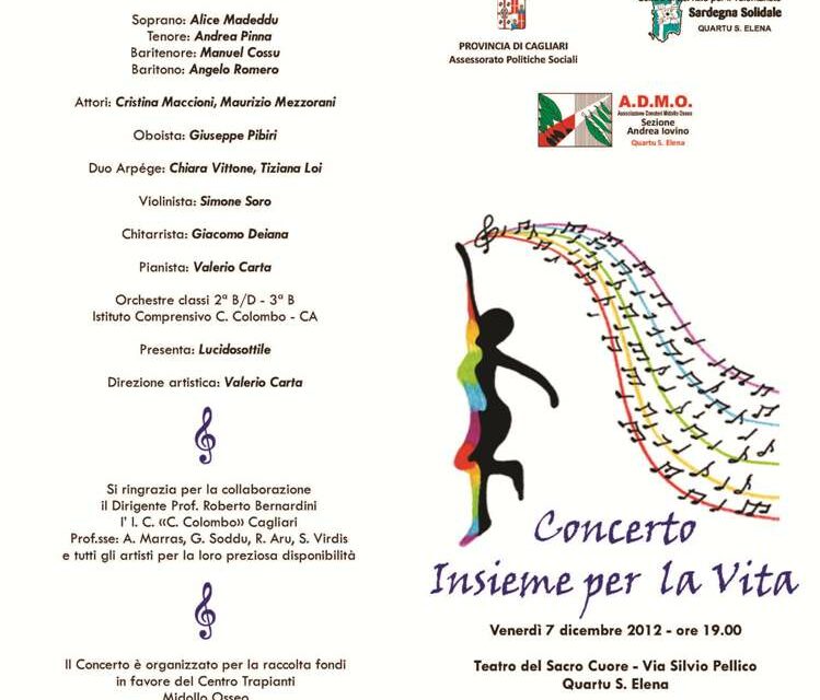 Si svolge venerdì 7 dicembre 2012 alle ore 19.00 presso il Teatro del Sacro Cuore in Via Silvio Pellico a Quartu S. Elena la manifestazione Concerto Insieme per la Vita promossa dall‘A.D.M.O., Associazione Donatori Midollo Osseo Sezione Andrea Iovino di Quartu S. Elena e dal CSV Sardegna Solidale Sa.Sol. Point n. 32 con il patrocinio della PROVINCIA DI CAGLIARI Assessorato Politiche Sociali.