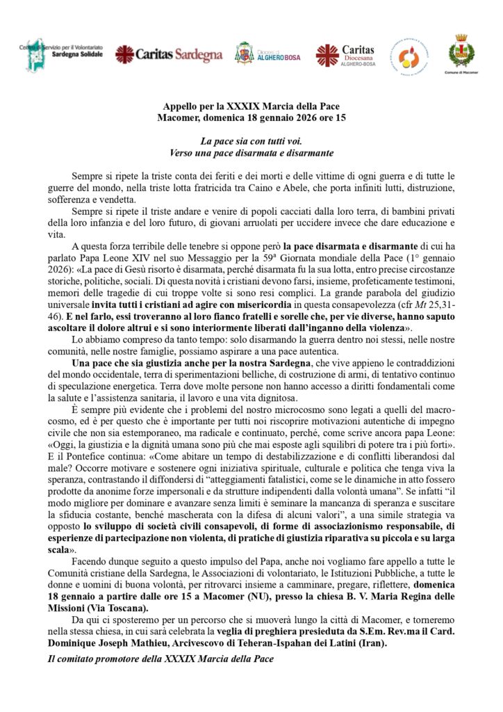 Si terrà a Macomer, il 18 gennaio, la XXXIX MARCIA DELLA PACE organizzata dalla Delegazione regionale Caritas Sardegna, in collaborazione con il CSV Sardegna Solidale ODV. Alla macchina organizzativa quest’anno si aggiungono la Diocesi di Alghero-Bosa e il Comune di Macomer.